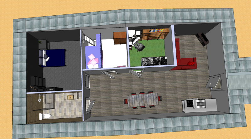 In een standaard woonhuis bevinden zich 3 slaapkamers, 1 badkamer en een woonkamer/keuken. Het dak bevat een paar kleine raampjes en zonnepanelen. De zonnenpanelen vangen overdag veel energie op en verwarmen zo 's nachts het huis. De muren zijn 1 meter dik en van ecologisch beton gemaakt. De muren bieden een goede bescherming tegen stormen, hete dagen en andere lastige omstandigheden.